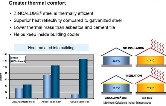 ZINCALUME® Steel has an alloy coating weight of 55% Aluminum (80% by Volume), 43.5% Zinc & 1.5% Silicon with 150gram/m2 coating weight is distributed equally on both sides of the coated strip. These sheets worldwide have set the standard for corrosion resistance and long life and are manufactured as per Australian Standard AS 1397:2002, American Standard ASTM A792M and Indian Standards IS 15961:2012 & ISO 9364. We provide ZINCALUME® steel which is extensively tested in laboratory and in actual conditions, to evaluate its corrosion resistance performance in different environments. It is particularly preferred for the tropical climates and marine environments.